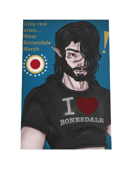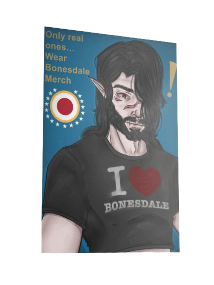 A poster that includes one of the owners main chararcters in Bonesdale merch! Just as a way to show that no matter who you are, you will look amazing in our merch!